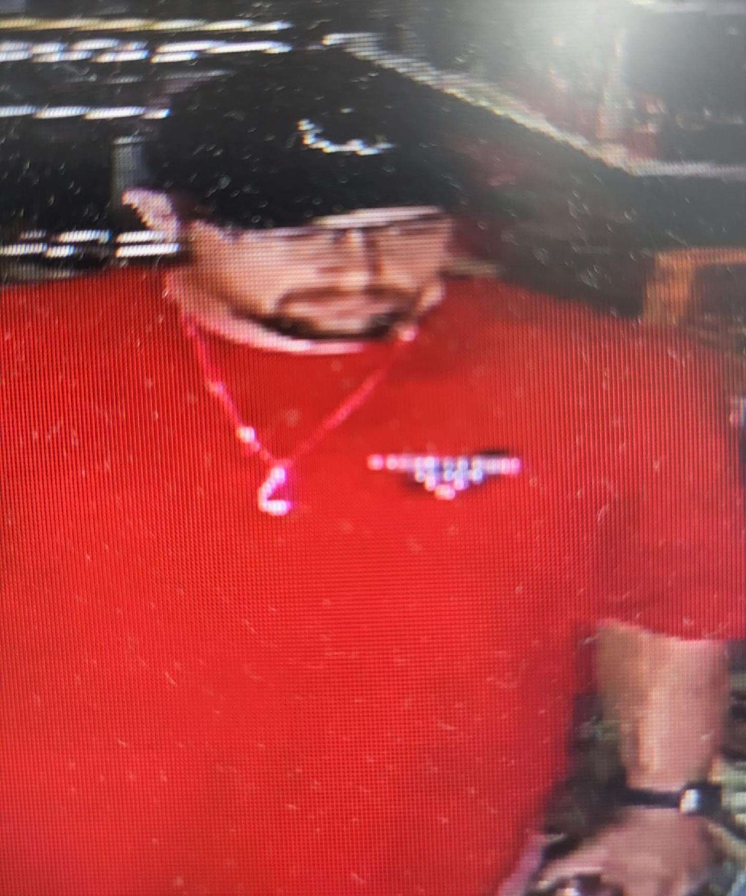 The suspect is described as a white male, about 5'7" - 5'10", and medium build. He was wearing a red shirt with "Best Buddy Outdoor Adventure Club" on it.